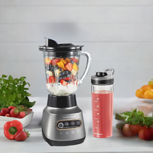 • Juicer blender for Shakes and Smoothies, Stainless Steel Ice Sabre Blades, 40oz Glass Jar,20oz Blend-In Portable Travel Jar, Gray