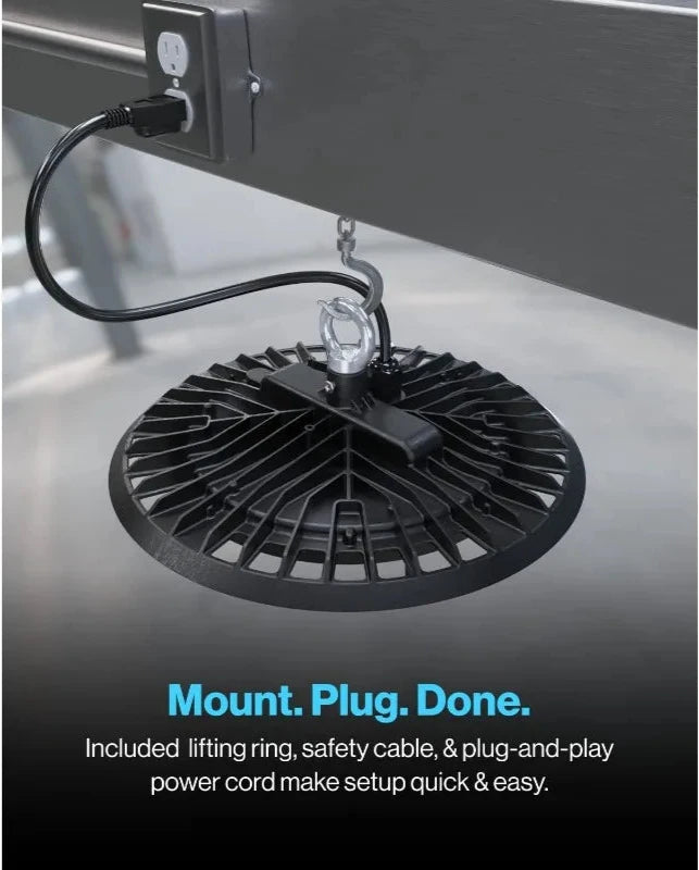 This LED high bay light boasts a powerful 150 watts, providing an impressive 19500 lumens of bright 5000K daylight illumination. Its shatterproof, waterproof design makes it ideal for industrial and commercial settings. The included power cord adds convenience and versatility. Trust in this expertly crafted fixture for exceptional performance.