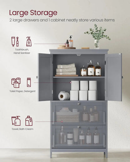 This freestanding bathroom storage unit features 2 drawers and 2 doors for versatile organization options. With an adjustable shelf and spacious interior, it provides ample storage space for all your bathroom essentials. Keep your toiletries and towels neatly organized and easily accessible.