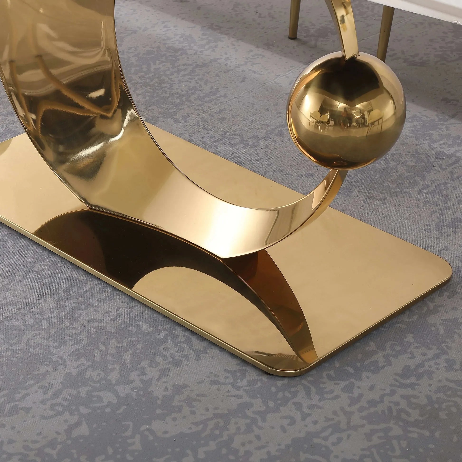This Carrara white stone dining table features exquisite natural marble with distinctive veining patterns characteristic of premium Italian stone. The luxurious tabletop is perfectly balanced on a sophisticated gold pedestal base, engineered for both stability and visual impact. carrara white stone dining table stone and warm metallic elements creates a versatile centerpiece that complements both traditional and contemporary interior designs while providing exceptional durability